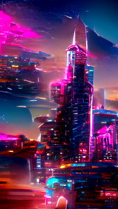 A captivating digital artwork featuring a futuristic city skyline, illuminated by neon lights and surrounded by an intricate network of buildings. The composition is rich in detail with a blend of modern architecture and advanced technology.