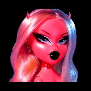 The image features a model in a provocative pose for an OnlyFans content. She is wearing a red wig and has an exaggerated makeup look with black lipstick. Her attire includes a corset and she is accessorized with a choker and collar. The setting suggests an intense, dark ambiance that complements the subject's alluring demeanor.