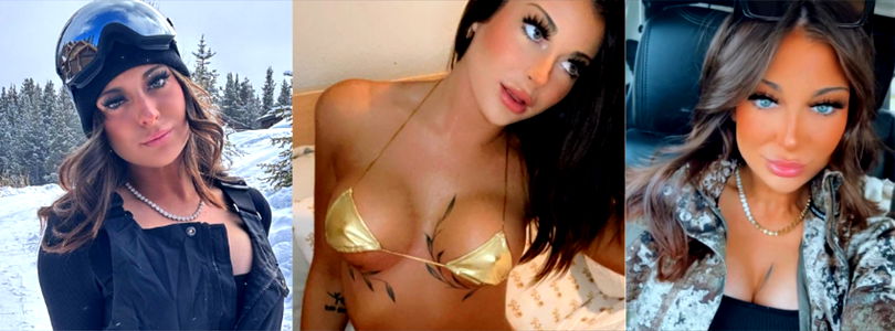 The image depicts a woman in a pink lingerie with blonde hair. She is wearing a necklace and has a visible tattoo on her right wrist. The background suggests an outdoor setting, possibly during twilight, given the soft light. This model appears to be from Texas, as indicated by the text in the image.