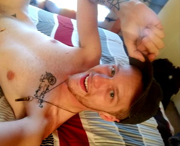 A shirtless man with tattoos and a beard is lying on a bed. His smile suggests he's in a comfortable and happy state.