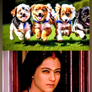 A whimsical image showcasing a dynamic scene of six dogs running, each adorned with a different expression of anticipation. The black and white composition captures the motion and joy of these playful pets.