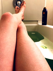 The image shows a person relaxing in an indoor bathtub. The individual is sitting with one leg crossed over the other, leaning slightly forward from a seated position on what appears to be a footed tub. They have long, light-colored hair and are wearing a pair of sunglasses, which rests on their legs within the tub. There's a bottle of shampoo or similar product near them. The setting suggests a serene atmosphere, with the bathtub as the main focus.