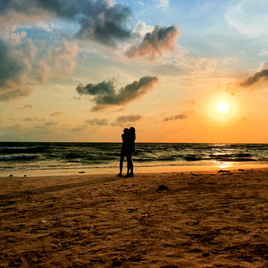 In this heartwarming photo, Michael and his companion are embracing on a sandy beach as the sun sets. The warm hues of the sky reflect off the ocean, creating a serene atmosphere. They seem to be enjoying a special moment together in this picturesque setting.