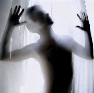 A nostalgic and artistic portrait of a model in a white dress, leaning out from behind a curtain. The mood is evocative with soft focus and subdued lighting. OnlyFans exclusive.