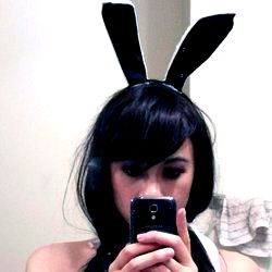 A candid moment of Triss Katanashi, an OnlyFans model from Ottawa, Ontario. She's captured in a bathroom mirror taking a selfie with her phone. Her bunny ears add a playful touch to the image.