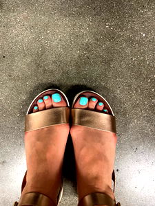 Close-up image of a person's bare feet with painted toenails, standing on artificial turf. The model is wearing an unbuttoned shirt and has a neutral expression.
