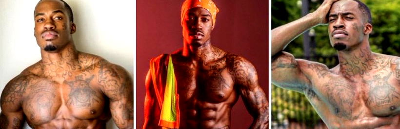 A shirtless man with visible tattoos and a strong physique, promoting OnlyFans. He is using his phone to touch or scratch one of the tatoos.