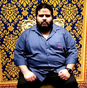 This is an image of a man dressed in a blue shirt and sitting on a chair. He appears to be middle-aged, given his wrinkles and grey hair. His attire suggests a formal or professional setting, perhaps indicative of work or a special event. The background features a patterned backdrop with intricate designs, providing a sense of depth and visual interest. No specific age is discernible from the image.