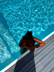 An OnlyFans model is seen leisurely swimming in an outdoor pool, enjoying the warm sun on a cloudy day.