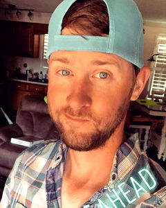 An image of Chase Hall, a 30-year-old male model, wearing a casual outfit consisting of a plaid shirt and a blue trucker hat, posing for a selfie in a homey setting. He has a beard and is wearing a necklace with a heart pendant. The background shows a kitchen area with cabinets.