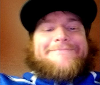 The image shows a bearded man with a cap on his head. He sports a mustache and has a full beard. His facial hair is well-groomed, and he seems to be in good spirits, as indicated by his smile.