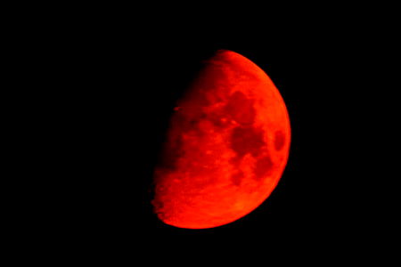 In the deep of night, a vibrant red supermoon stands out against the stark black sky, casting a striking contrast. The moon's fullness illuminates the darkness and adds a touch of magic to the scene.