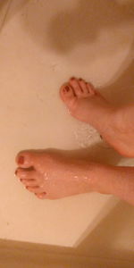 TigerVintage, the well-known content creator on OnlyFans, invites you for a behind-the-scenes look at their feet. In this exclusive image, we see TigerVintage stepping into a bathtub, revealing their freshly pedicured toes. The toes are painted in a vibrant shade of red, contrasting beautifully with the white tiles surrounding the tub. TigerVintage's feet, along with their toes, are the stars of this image.