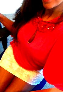 Sherazade, a stunning model, is seen sitting in front of a desk. She's wearing a vibrant red dress with a pink blouse, white skirt, and high heels. Her hair is styled in an updo, accentuating her eyes and the necklace she's wearing. In the background, there's a window letting in natural light. A coffee cup is also visible on the desk, suggesting she might be taking a break or enjoying some tea. The overall ambiance of the photo is bright and cheerful, capturing Sherazade's lively spirit.