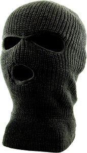 A grey knitted balaclava featuring eye holes and a mouth opening. This type of garment is often associated with skiing or cold weather protection, but it's important to note that it may also be used in criminal activities. In this case, the balaclava has been styled as a mask.