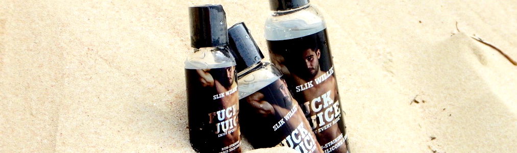 An OnlyFans model named SlikWillie is prominently featured in this image, posing with several bottles that appear to be related to skincare or grooming products. The setting seems to be an outdoor space with a sandy ground, and there are three bottles visibleโone appears to be larger and upright, another smaller bottle reclined on its side, and a third bottle lying flat.