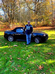 The image shows an individual taking a selfie outside in the daytime. He is smiling and appears to be enjoying the moment. The background features trees, suggesting a suburban or rural setting. His attire includes glasses and a patterned jacket, indicating he might have a preference for casual yet stylish clothing.