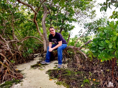 A man posing for the camera while sitting on a rock amidst a scenic mangrove setting.