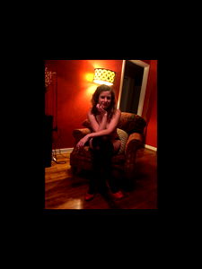 In this image, we see Emire in a casual yet stylish setting. She's wearing a black shirt that adds to her edgy look. Her pose and expression suggest confidence and self-assuredness. The background is blurred but appears to be an indoor space, perhaps a home or a studio.