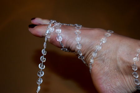 The model showcases a toe ring in one foot and a dazzling diamond ring on the big toe, highlighting her fashion-forward accessorizing. Her feet are positioned in front of an intricate feather boa.