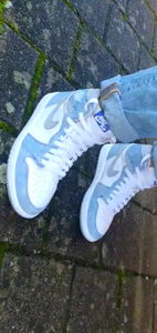 The image showcases a pair of vibrant sneakers with a mix of colors, including blue, pink, and white. The sneakers appear to be worn by someone named Lara. They are positioned against a gray background, possibly on a tiled floor. The person's legs are visible as they are wearing black pants and a white top, with the sneakers being the focal point of the image. It seems to be an indoor setting, given the uniformity of the ground surface. The overall composition suggests that Lara might have a preference for colorful footwear.