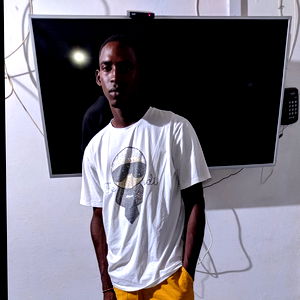 In the image, Jorman Murillo is standing in a room. He is wearing a white t-shirt with a graphic on it and yellow shorts. The room has a television and an open door. The man appears to be in casual attire, possibly indicating a relaxed environment.