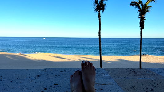 The image showcases a person's feet, covered with sand, resting on a beach. The feet are in sharp focus, while the rest of the body is out of view, creating an interesting perspective.