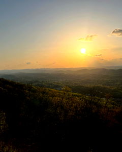 Join Chrissa on her journey through the scenic landscape, where nature's beauty unfolds at sunset. A breathtaking view of a valley with mountains and trees under a clear sky.