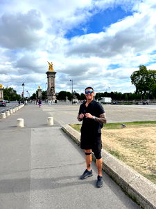 The image features a person dressed in athletic attire, standing confidently with their hands on their hips. They are wearing sunglasses and seem to be enjoying a day out in the city. In the background, there is a significant landmark that adds a historical context to the photograph. The individual appears to be in their mid-20s.