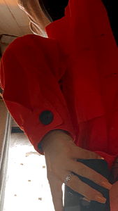 A dynamic street scene featuring a red coat, bag, and blurred background.