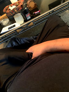 This is an image of JakeFromStateFarm, who appears to be in a relaxed and playful pose with a focus on his lower body. The image has been manipulated to blur out any revealing details. It's likely that the context of the photo could suggest humor or lightheartedness.