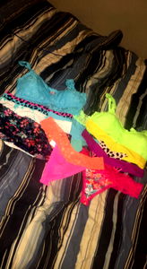 Model Mya showcasing a variety of colorful and patterned lingerie, including bras and undies. Each piece is vibrant and eye-catching with different styles and designs. The photo captures the essence of a lingerie brand with an emphasis on self-expression and style diversity.