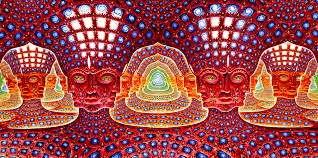 An intriguing piece of art featuring four figures, possibly in a space or futuristic setting, with vibrant colors and abstract patterns. The artwork is rich in detail and color, providing a striking visual experience.
