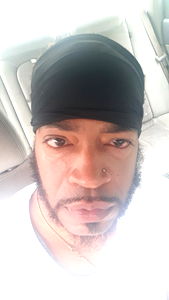 An individual wearing a black headwrap and earring, seated in a vehicle, appears to be in his 30s.