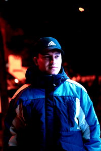 A close-up portrait of a person, captured in a dimly lit environment. The individual is looking downwards with a contemplative expression. Their attire appears to be casual and they seem absorbed in their own thoughts.
