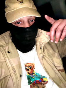 Uncle Willie Son, a rising hip hop artist from Upstate NY, strikes a confident pose in a black and white photo. He's seen wearing a brown baseball cap and a camouflage jacket. The photo captures him in an expressive pose with his right hand pointing downwards. A distinctive feature of the image is Uncle Willie's playful expression, suggesting he's enjoying himself. His attire, paired with the background, hint at a casual, relaxed vibe often associated with hip hop culture.