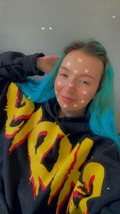 A creative portrait of an individual in a relaxed pose. The person has bright blue hair and a vibrant yellow tattoo on their arm, adding to the unique style. They are wearing a black hoodie with bold red text.