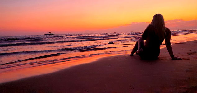 A stunning OnlyFans model, Vanessa, captured in a serene beach setting during sunset. She is seen sitting on the sand with the tranquil ocean as her backdrop. The image also features a mesmerizing sky transitioning from warm hues of orange to soothing shades of blue, creating a captivating contrast.