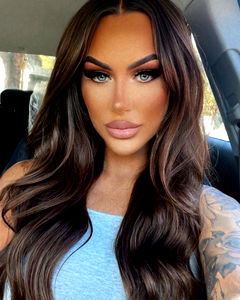 This image features a professional model with striking features. She is known for her dramatic tattoos, long brown hair, and vibrant makeup. The model exudes confidence and style, showcasing a sense of fashion that is both edgy and sophisticated.