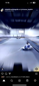 Screenshot of an Instagram post showing a racing game screenshot, featuring a blurred character in motion. The post has been shared from Onlyfans by โ . The photo is taken at Greensboro, NC 336.