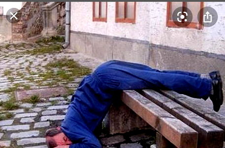 An individual dressed in blue is seen taking a tumble off the balcony, landing on a wooden bench. They appear to be in the process of losing balance and might need some assistance.