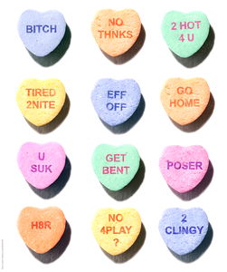 A collection of vibrant, heart-shaped candies with witty sayings such as 'No thanks' and 'U r stupid'. The candies are in a neat row, ready for gift-giving. They come in different sizes and colors, adding to their charm. Perfect for Valentine's Day!