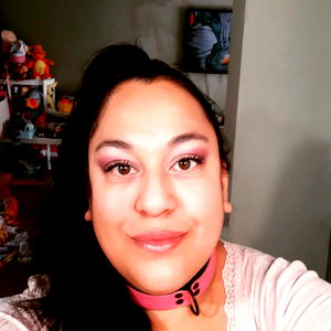 The image shows a woman wearing a pink choker and eye shadow, taking a selfie in what appears to be her room. She has long hair and is making a playful face for the camera.