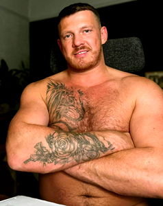 This is an image of a man with a tattooed torso, flexing his muscles while seated at a table. He is shirtless and wearing only shorts. The background features a dark space with minimal lighting, emphasizing the subject's physique. There is no text present in the image.
