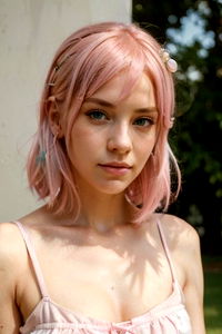An OnlyFans model with a youthful appearance and a unique style, wearing pink and white makeup, light pink hair accessory, and a tank top. The model is posing outdoors for the image.