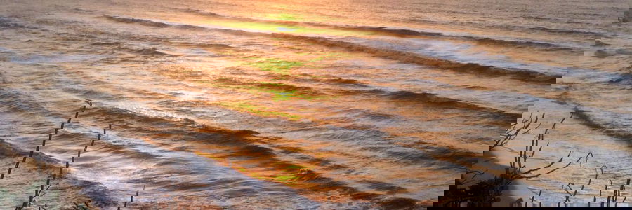 This image captures a beautiful sunset over the ocean. The warm orange hues of the setting sun cast long shadows on the sandy beach, while the vast expanse of the sea stretches out to meet the sky. It's a peaceful scene that invites contemplation and relaxation.